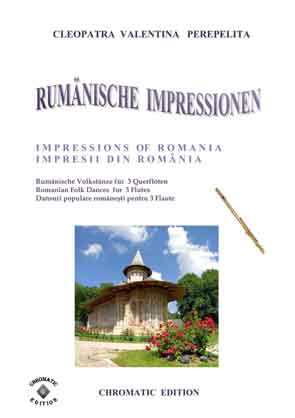 Cleopatra V. Perepelita RUMÄNISCHE IMPRESSIONEN Rumänische Volkstänze - 3 Querflöte Die hier vorliegenden Kompositionen und die kurze Einführung in die wichtigsten rumänischen Volkstänze und Volkslieder sind als Beitrag gedacht, diesen reichen, folkloristischen Raum bekannter zu machen. Hier sprudelt eine originelle, erfrischende Folklore, die entstanden ist aus den Rhythmen und Melodien der Ferne, verknüpft mit den Bräuchen und Traditionen der Bewohner nördlich der unteren Donau. Dieser Zyklus erscheint außer in der Klavierfassung auch in Versionen für Violine, Cello, Querflöte, Klarinette und Saxofon, sowohl als Duo wie auch als Trio. Zusätzlich sind zwischen 2008 - 2011 noch weitere Versionen erschienen: für Violine und Klavier, Violoncello und Klavier, Kontrabass und Klavier, Bratsche und Klavier, Querflöte und Klavier, Oboe und Klavier, Klarinette und Klavier sowie Trompete und Klavier. Alle Fassungen sind in der Tonart aufeinander abgestimmt, so dass sich dadurch vielfältige Möglichkeiten des Zusammenspiels ergeben. Schwierigkeitsgrad: leicht bis mittelschwer.