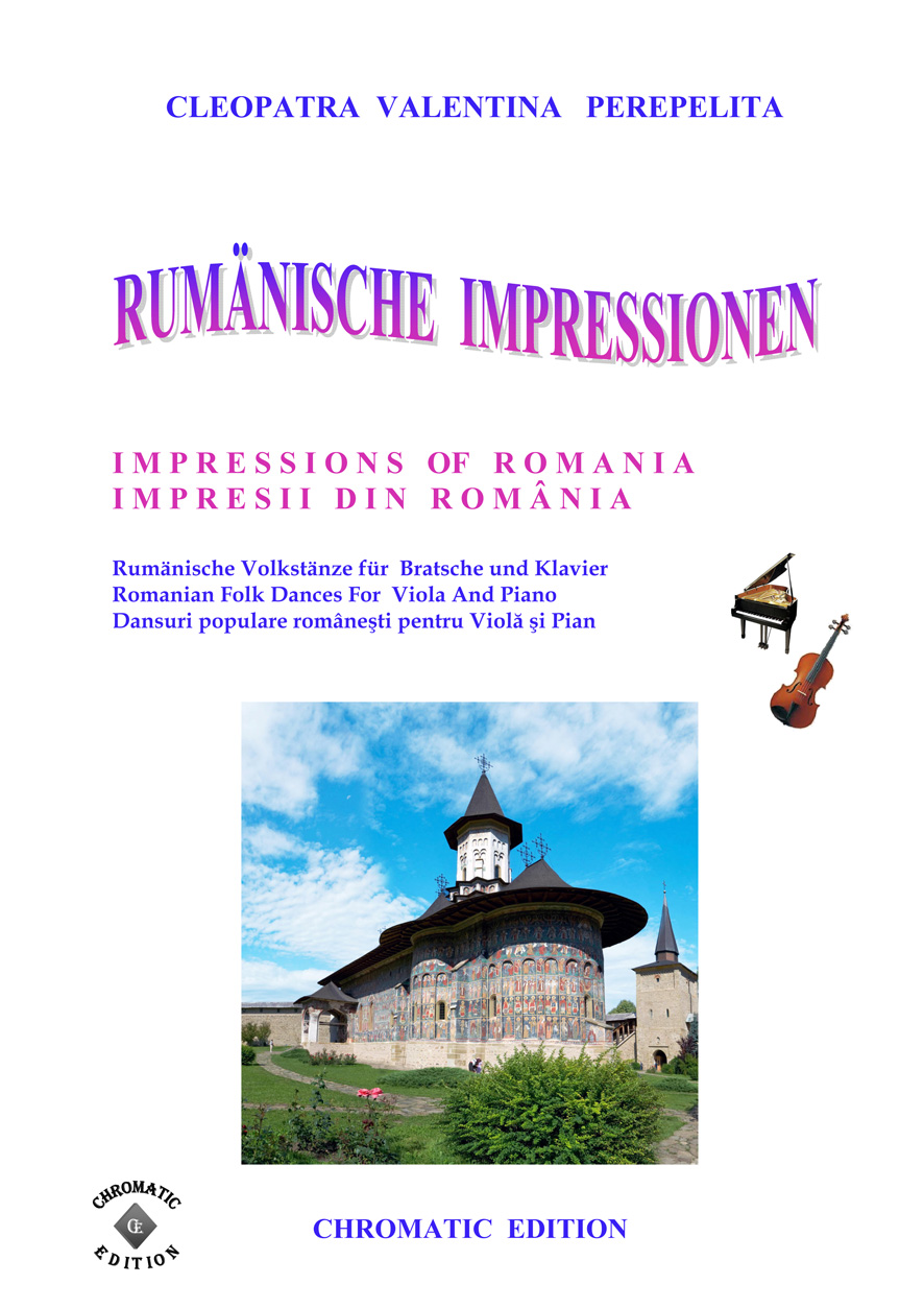 Cleopatra V. Perepelita RUMÄNISCHE IMPRESSIONEN Rumänische Volkstänze - Bratsche und Klavier Die hier vorliegenden Kompositionen und die kurze Einführung in die wichtigsten rumänischen Volkstänze und Volkslieder sind als Beitrag gedacht, diesen reichen, folkloristischen Raum bekannter zu machen. Hier sprudelt eine originelle, erfrischende Folklore, die entstanden ist aus den Rhythmen und Melodien der Ferne, verknüpft mit den Bräuchen und Traditionen der Bewohner nördlich der unteren Donau. Dieser Zyklus erscheint außer in der Klavierfassung auch in Versionen für Violine, Cello, Querflöte, Klarinette und Saxofon, sowohl als Duo wie auch als Trio. Zusätzlich sind zwischen 2008 - 2011 noch weitere Versionen erschienen: für Violine und Klavier, Violoncello und Klavier, Kontrabass und Klavier, Bratsche und Klavier, Querflöte und Klavier, Oboe und Klavier, Klarinette und Klavier sowie Trompete und Klavier. Alle Fassungen sind in der Tonart aufeinander abgestimmt, so dass sich dadurch vielfältige Möglichkeiten des Zusammenspiels ergeben. Partitur und Stimmen. Schwierigkeitsgrad: leicht bis mittelschwer.