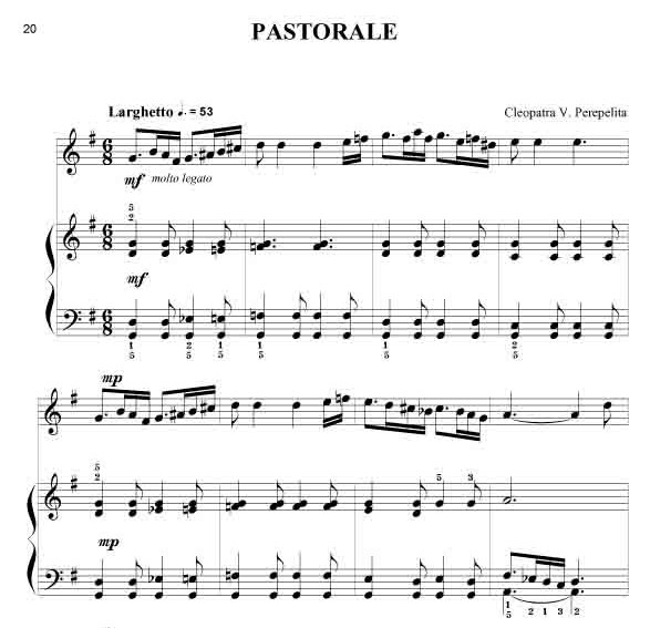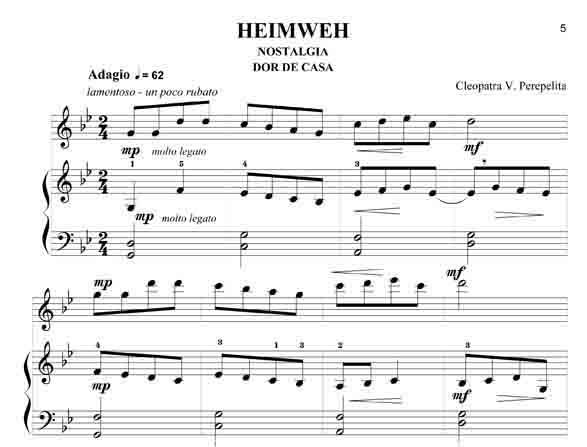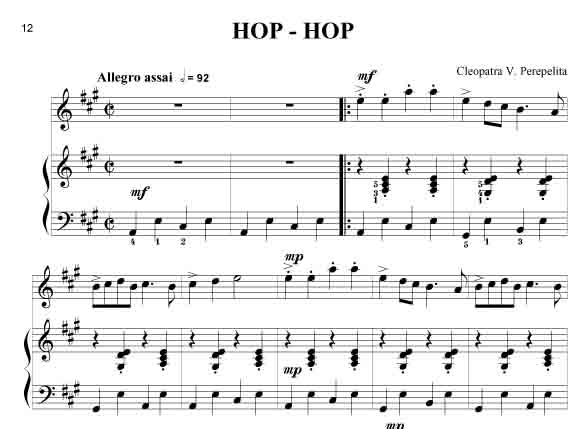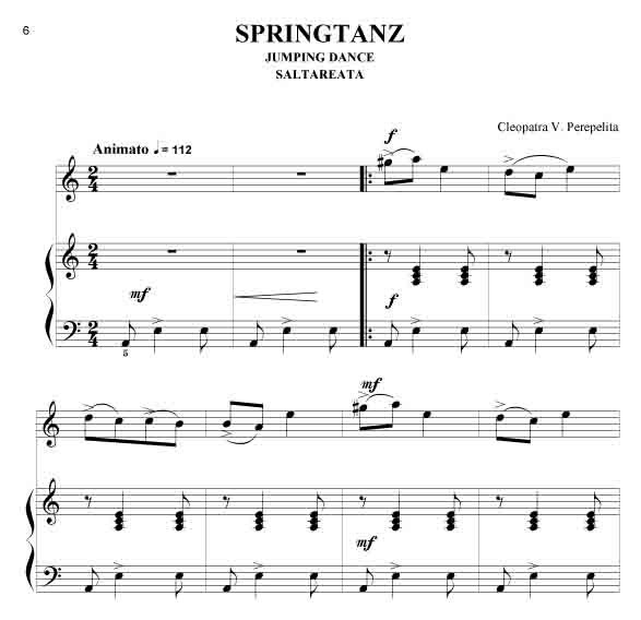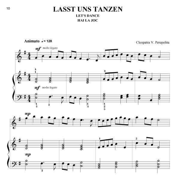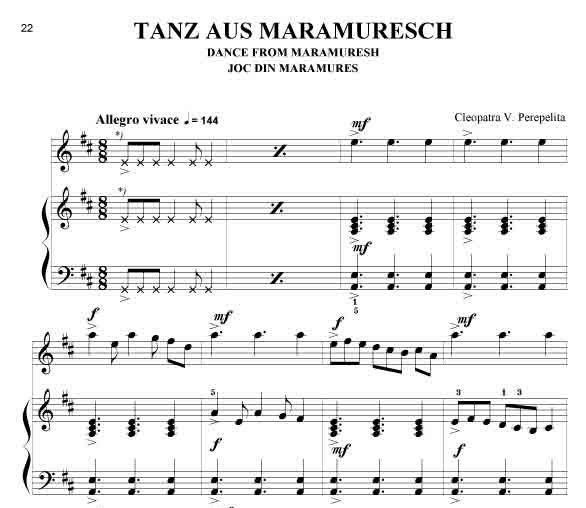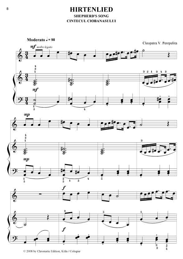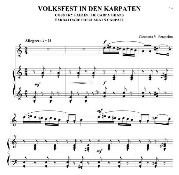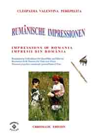 Cleopatra V. Perepelita RUMÄNISCHE IMPRESSIONEN Rumänische Volkstänze - Querflöte und Klavier Die hier vorliegenden Kompositionen und die kurze Einführung in die wichtigsten rumänischen Volkstänze und Volkslieder sind als Beitrag gedacht, diesen reichen, folkloristischen Raum bekannter zu machen. Hier sprudelt eine originelle, erfrischende Folklore, die entstanden ist aus den Rhythmen und Melodien der Ferne, verknüpft mit den Bräuchen und Traditionen der Bewohner nördlich der unteren Donau. Dieser Zyklus erscheint außer in der Klavierfassung auch in Versionen für Violine, Cello, Querflöte, Klarinette und Saxofon, sowohl als Duo wie auch als Trio. Zusätzlich sind zwischen 2008 - 2011 noch weitere Versionen erschienen: für Violine und Klavier, Violoncello und Klavier, Kontrabass und Klavier, Bratsche und Klavier, Querflöte und Klavier, Oboe und Klavier, Klarinette und Klavier sowie Trompete und Klavier. Alle Fassungen sind in der Tonart aufeinander abgestimmt, so dass sich dadurch vielfältige Möglichkeiten des Zusammenspiels ergeben. Partitur und Stimmen. Schwierigkeitsgrad: leicht bis mittelschwer.