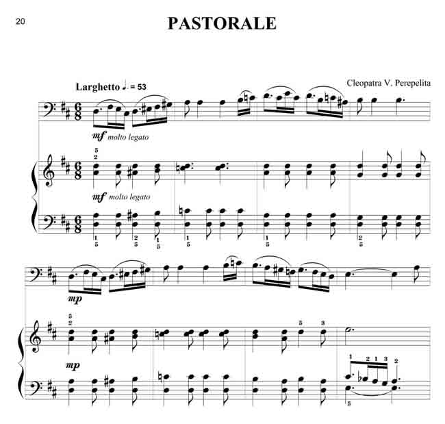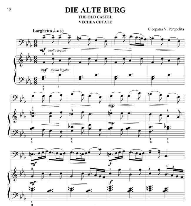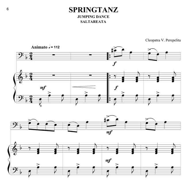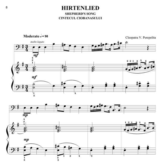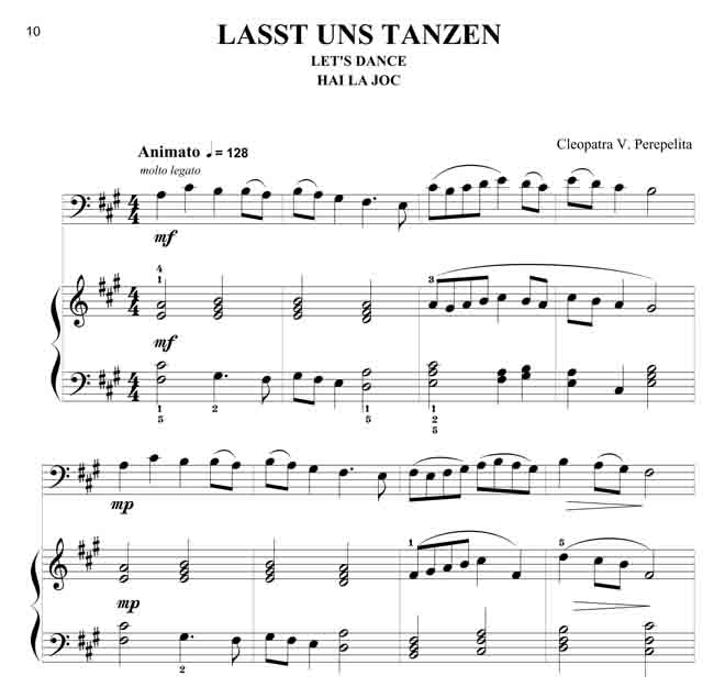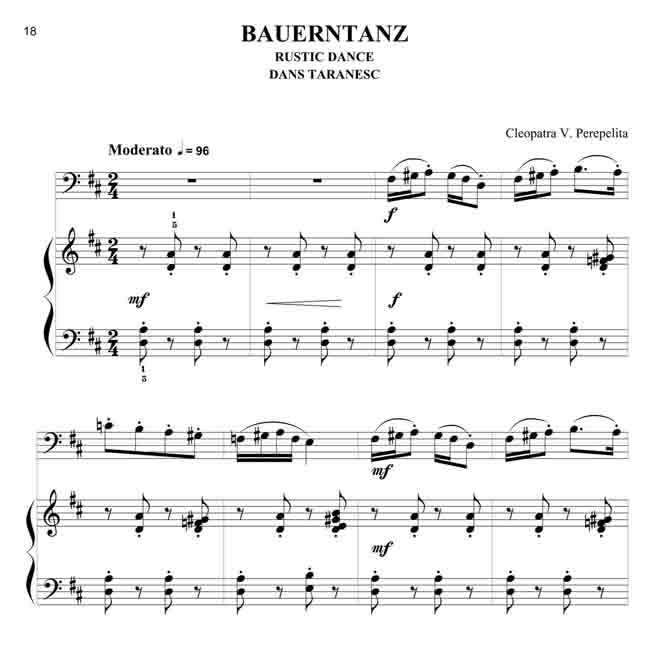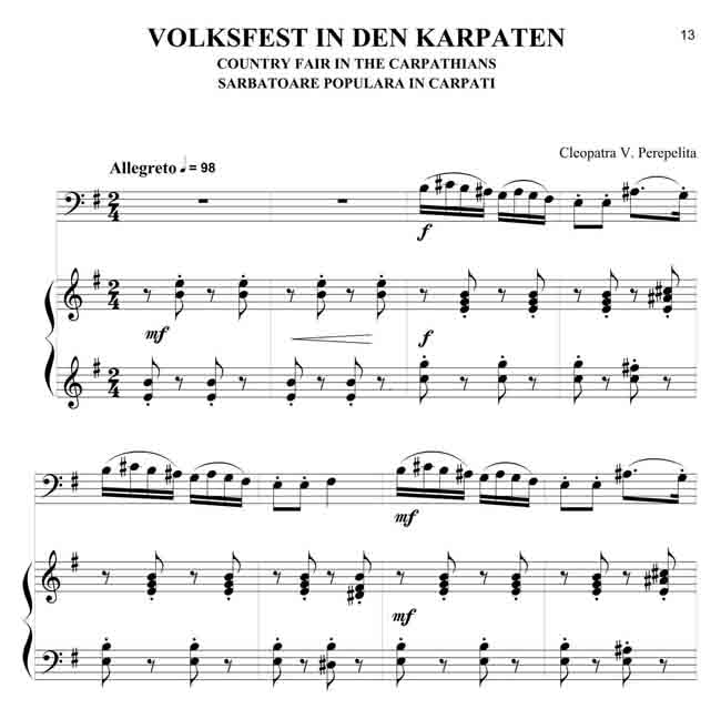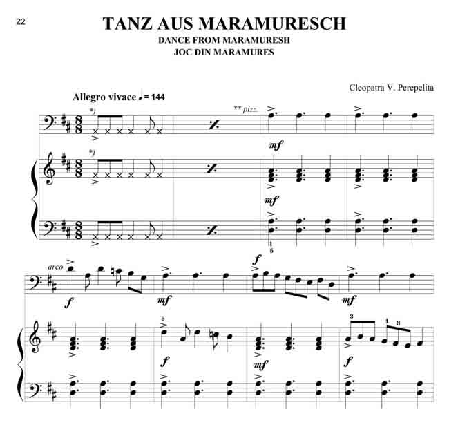 Cleopatra V. Perepelita RUMÄNISCHE IMPRESSIONEN Rumänische Volkstänze - Kontrabass und Klavier Die hier vorliegenden Kompositionen und die kurze Einführung in die wichtigsten rumänischen Volkstänze und Volkslieder sind als Beitrag gedacht, diesen reichen, folkloristischen Raum bekannter zu machen. Hier sprudelt eine originelle, erfrischende Folklore, die entstanden ist aus den Rhythmen und Melodien der Ferne, verknüpft mit den Bräuchen und Traditionen der Bewohner nördlich der unteren Donau. Dieser Zyklus erscheint außer in der Klavierfassung auch in Versionen für Violine, Cello, Querflöte, Klarinette und Saxofon, sowohl als Duo wie auch als Trio. Zusätzlich sind zwischen 2008 - 2011 noch weitere Versionen erschienen: für Violine und Klavier, Violoncello und Klavier, Kontrabass und Klavier, Bratsche und Klavier, Querflöte und Klavier, Oboe und Klavier, Klarinette und Klavier sowie Trompete und Klavier. Alle Fassungen sind in der Tonart aufeinander abgestimmt, so dass sich dadurch vielfältige Möglichkeiten des Zusammenspiels ergeben. Partitur und Stimmen. Schwierigkeitsgrad: leicht bis mittelschwer.