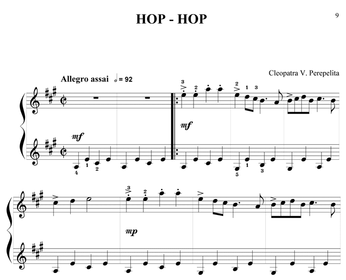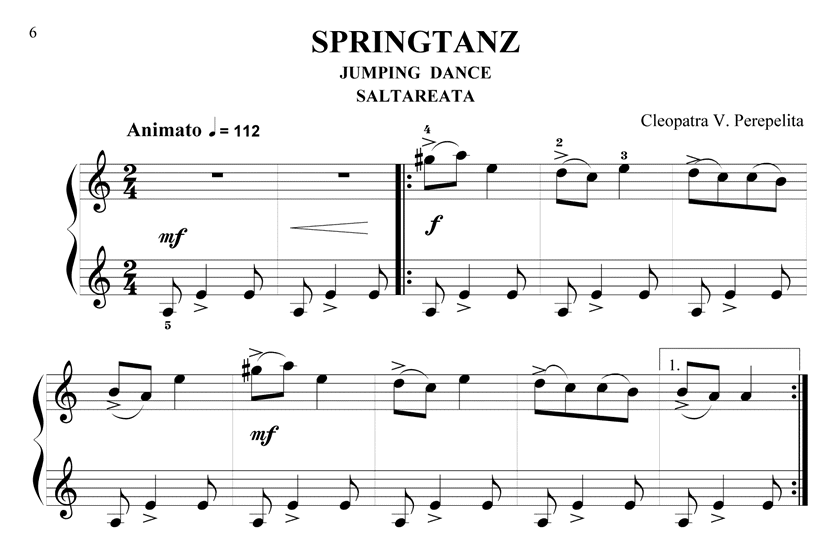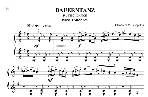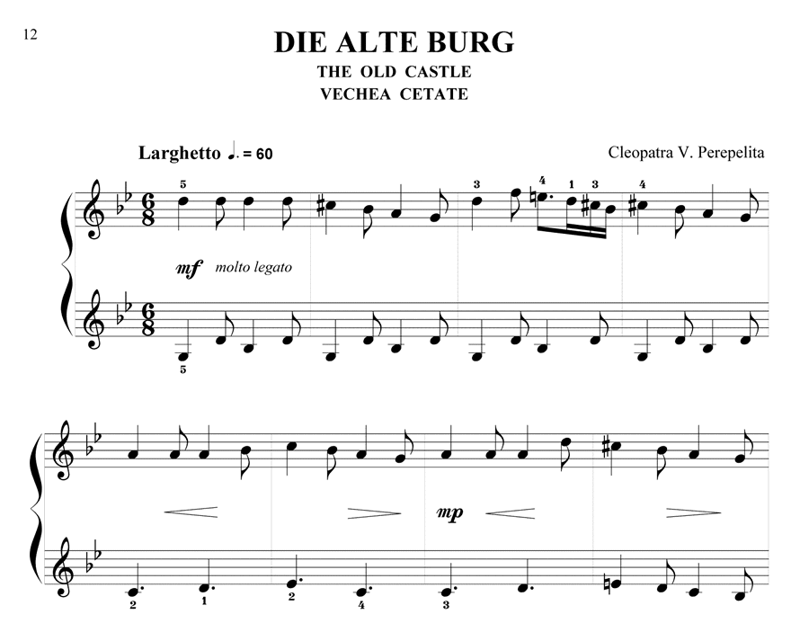 Cleopatra V. Perepelita RUMÄNISCHE IMPRESSIONEN Rumänische Volkstänze - Klavier Die hier vorliegenden Kompositionen und die kurze Einführung in die wichtigsten rumänischen Volkstänze und Volkslieder sind als Beitrag gedacht, diesen reichen, folkloristischen Raum bekannter zu machen. Hier sprudelt eine originelle, erfrischende Folklore, die entstanden ist aus den Rhythmen und Melodien der Ferne, verknüpft mit den Bräuchen und Traditionen der Bewohner nördlich der unteren Donau. Dieser Zyklus erscheint außer in der Klavierfassung auch in Versionen für Violine, Cello, Querflöte, Klarinette und Saxofon, sowohl als Duo wie auch als Trio. Zusätzlich sind zwischen 2008 - 2011 noch weitere Versionen erschienen: für Violine und Klavier, Violoncello und Klavier, Kontrabass und Klavier, Bratsche und Klavier, Querflöte und Klavier, Oboe und Klavier, Klarinette und Klavier sowie Trompete und Klavier. Alle Fassungen sind in der Tonart aufeinander abgestimmt, so dass sich dadurch vielfältige Möglichkeiten des Zusammenspiels ergeben. Schwierigkeitsgrad: leicht bis mittelschwer. Hörbeispiele: You Tube unter Perepelita.
