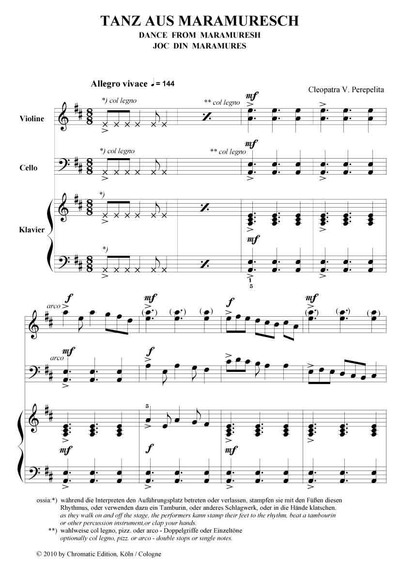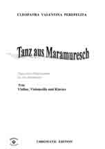 Cleopatra V. Perepelita TANZ AUS MARAMURESCH TRIO: Violine, Violoncello und Klavier „Tanz aus Maramuresch“ ist eine Komposition aus der Suite „Rumänische Impressionen“. Dieser Zyklus erscheint außer in der Klavierfassung auch in Versionen für Violine, Cello, Querflöte, Klarinette und Saxofon, sowohl als Duo wie auch als Trio. Zusätzlich sind zwischen 2008 - 2011 noch weitere Versionen erschienen: für Violine und Klavier, Violoncello und Klavier, Kontrabass und Klavier, Bratsche und Klavier, Querflöte und Klavier, Oboe und Klavier, Klarinette und Klavier sowie Trompete und Klavier. Alle Fassungen sind in der Tonart aufeinander abgestimmt, so dass sich dadurch vielfältige Möglichkeiten des Zusammenspiels ergeben. Partitur und Stimmen.