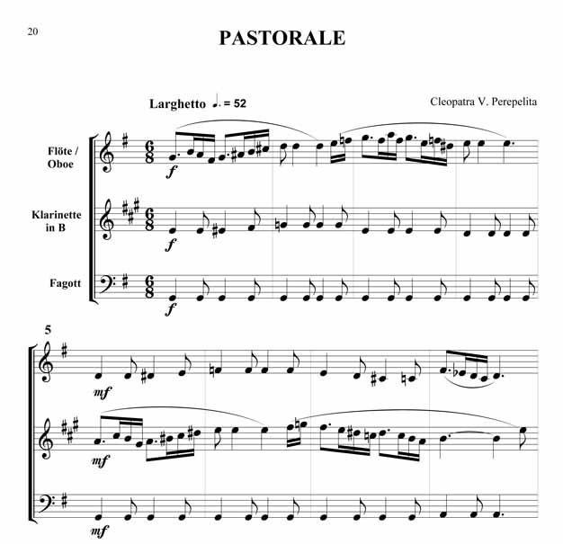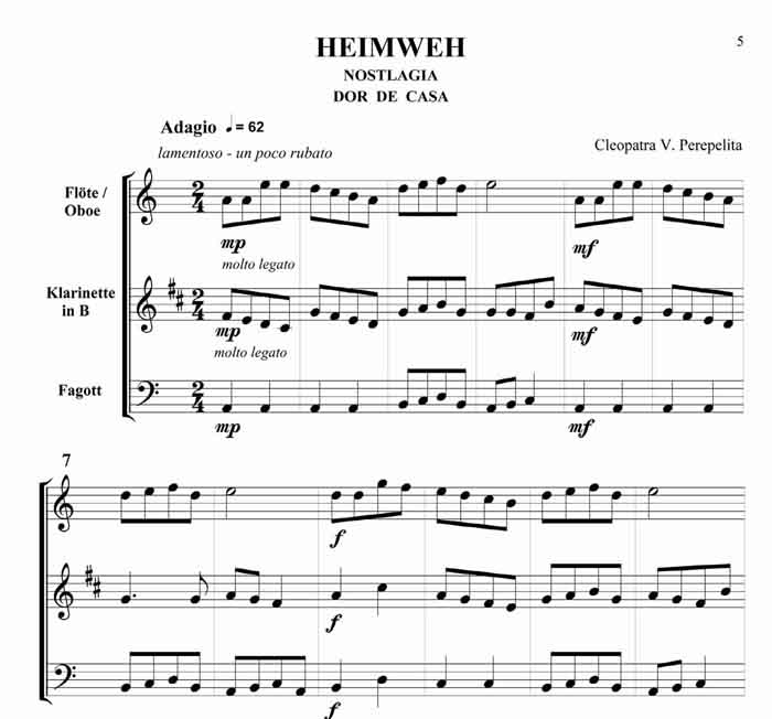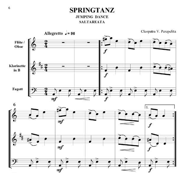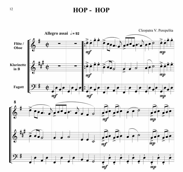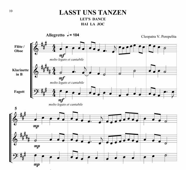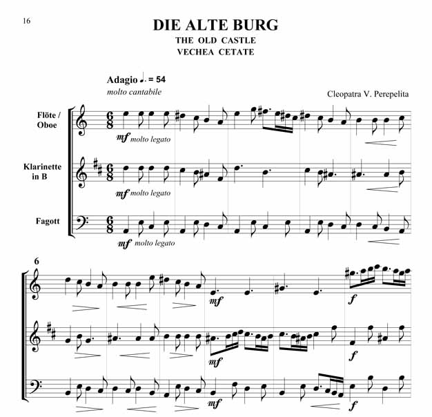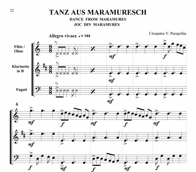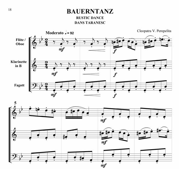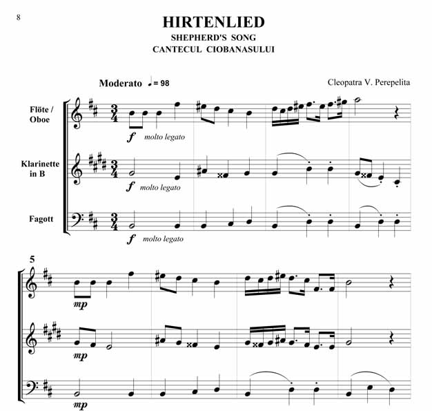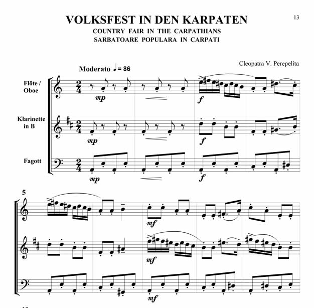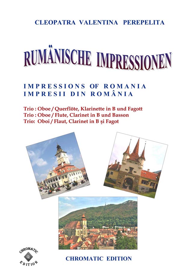 Cleopatra V. Perepelita Rumänische Impressionen Trio für Oboe oder Querflöte, Klarinette in B und Fagott Die hier vorliegenden Kompositionen und die kurze Einführung in die wichtigsten rumänischen Volkstänze und Volkslieder sind als Beitrag gedacht, diesen reichen, folkloristischen Raum bekannter zu machen. Hier sprudelt eine originelle, erfrischende Folklore, die entstanden ist aus den Rhythmen und Melodien der Ferne, verknüpft mit den Bräuchen und Traditionen der Bewohner nördlich der unteren Donau. Dieser Zyklus erscheint außer in der Klavierfassung auch in Versionen für Violine, Cello, Querflöte, Klarinette und Saxofon, sowohl als Duo wie auch als Trio. Zusätzlich sind zwischen 2008 - 2011 noch weitere Versionen erschienen: für Violine und Klavier, Violoncello und Klavier, Kontrabass und Klavier, Bratsche und Klavier, Querflöte und Klavier, Oboe und Klavier, Klarinette und Klavier sowie Trompete und Klavier. Partitur und Stimmen Scwierigkeitsgrad - Leicht bis Mittelschwer