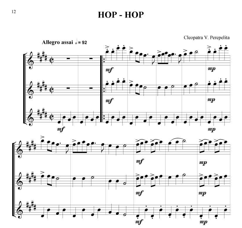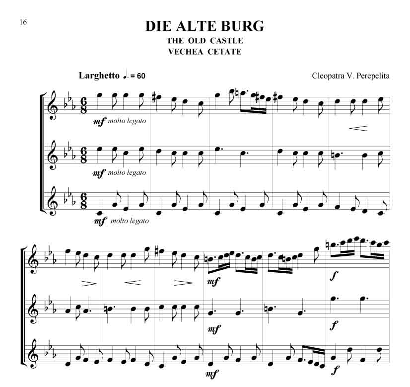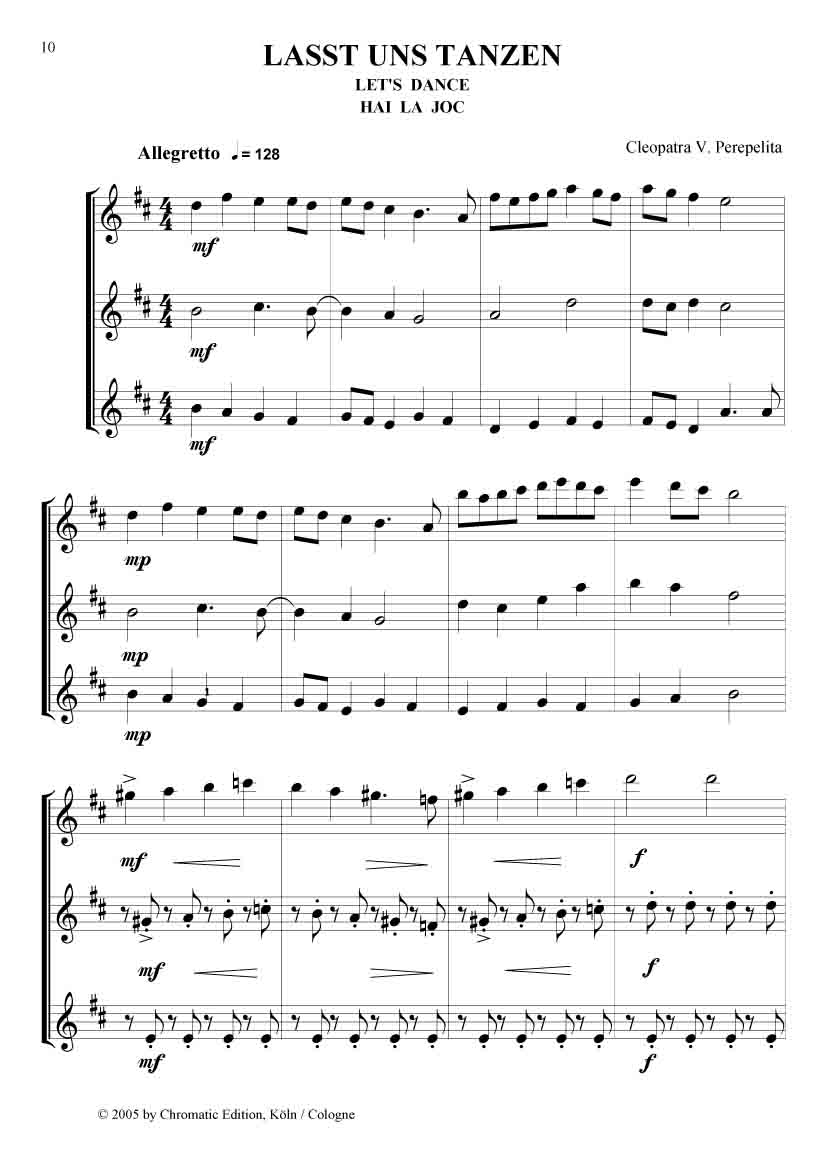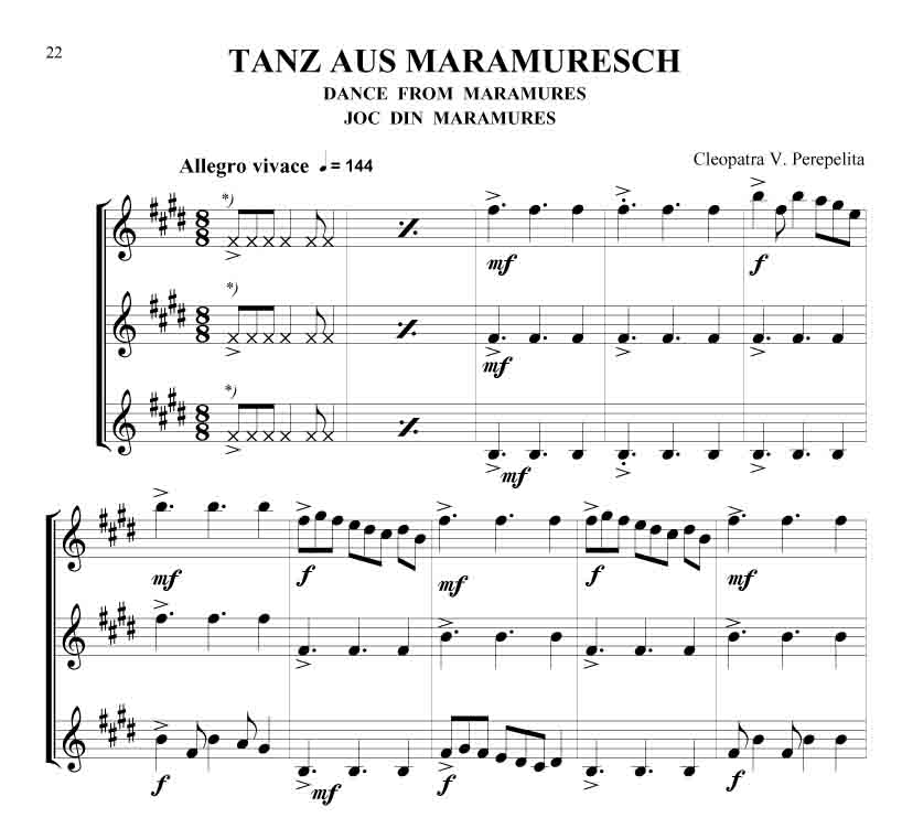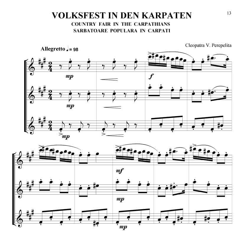 Cleopatra V. Perepelita IMPRESSIONS OF ROMANIA Romanian Folk Dances - 3 Altsaxophone in EsThe edition of these works, and the short introduction to the most important Romanian dances and folksongs, shall make the rich folklore of this region, better known and understood by a larger audience. Here a refreshingly original folklore springs up, arising from the rhythms and melodies of the Orient, combined with the customs and traditions of the inhabitants from the regions north of the Danube. The pieces in this edition are available not only for piano, but also for violin, violoncecello, clarinet, flute, and saxophone, as duets as well as trios. Other available versions: for violin and piano, violoncello and piano, contrabass and piano, viola and piano, flute and piano, oboe and piano, clarinet and piano and for trumpet and piano. All versions are written in the same key, offering various possibilities for ensemble playing. Elementary and intermediate level.